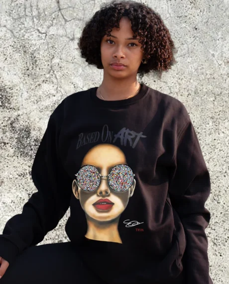 👓🎉 Cette œuvre d’Émilie Gosselin, issue de la collection IN COLOR, représente une femme qui s’affirme avec confiance. Chauve et portant des lunettes ornées de cristaux colorés, elle incarne la liberté et l’audace dans un univers à l’esprit festif et éclatant.